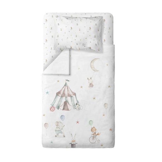 The duvet cover and one pillowcase in the duvet cover set are produced in the pattern you choose to suit your child's room and taste, and the bed sheet and one pillowcase are designed in the Circus pattern.